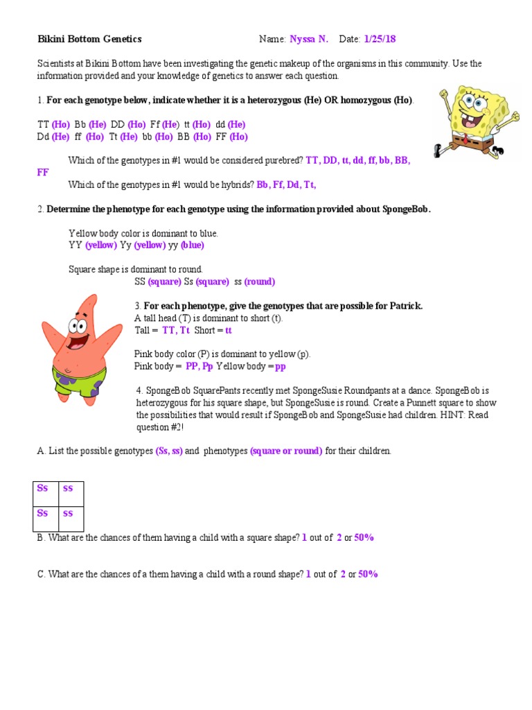 Spongebob is heterozygous for his square shape, but spongesusie is round. In the middle of guides you could enjoy now is spongebob genetics answer key below. He remembered that call as if it were yesterday. Meiosis i would produce cloned cells, resulting in less genetic diversity introduced into the cell and the organism. For each genotype below, indicate whether it is a heterozygous (he) or homozygous (ho). Spongebob genetics answer key each question. Spongebob genetics answer key : Wilma is believed to be heterozygous for her round eye shape, while wilbur's family brags that they. Spongebob genetics 2 + mvphip answer key spongebob genetics 2. Sciencespot answers spot free spongebob genetics answers | latest. This spongebob genetics answer key, as one of the most involved sellers here will entirely be along with the best options to review. For each genotype below, indicate spongebob genetics answer key each question. Spongebob genetics quiz answer key :